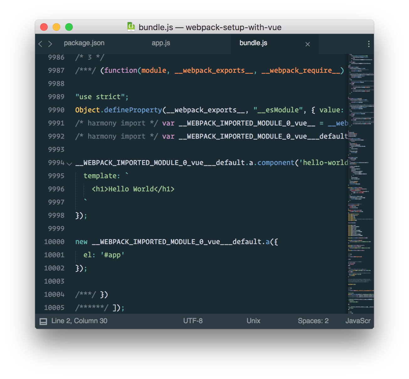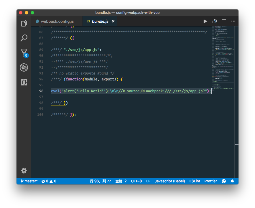 根目录中 Webpack 为我们自动生成了 dist 目录,打开其中的 bundle.js,拖到底部,就有 app.js 中提取出来的内容,大概类似这样,包含之前写 hello world 例子: