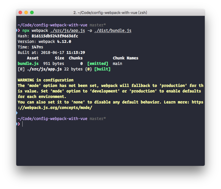 npx webpack ./src/js/app.js -o ./dist/bundle.js --mode development 解决,这边没有加因为之后会写到。简单提一下,随着 Webpack 4 推出的「零配置」概念,它也要求在配置中写入一个 mode 的选项,development 或者是 production,通过这个选项 Webpack 会自动输出合适的打包。通过配置文件进行打包