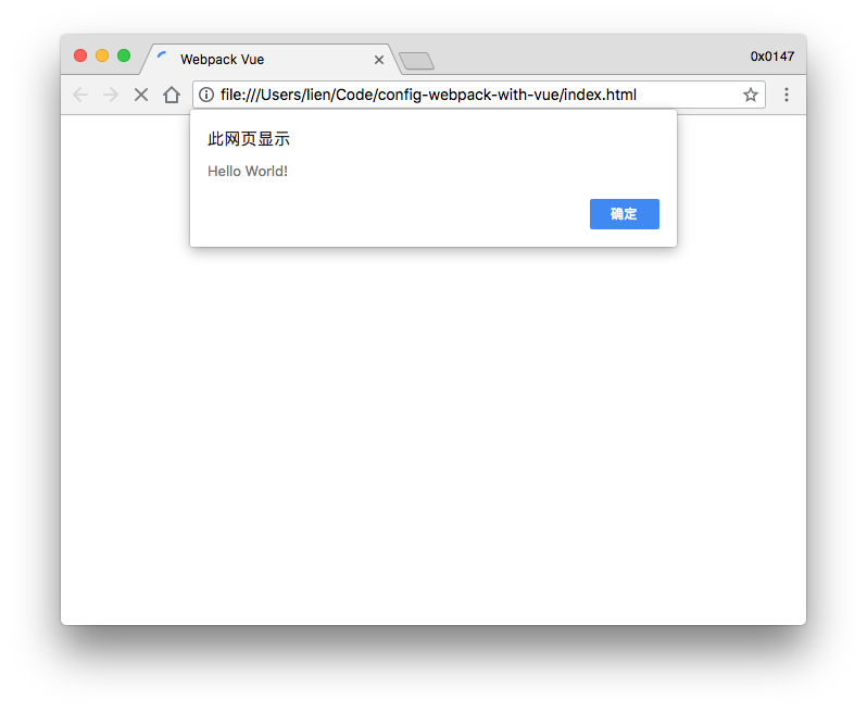 JavaScript 打包完成,我们还缺什么让它运行起来?在浏览器环境中,当然是一个 html 文件。新建 index.html 文件,将基本的结构填充进去,并且在 </body> 之前引入之前成功打包的 bundle.js;在浏览器中打开,就可以看到 alert: