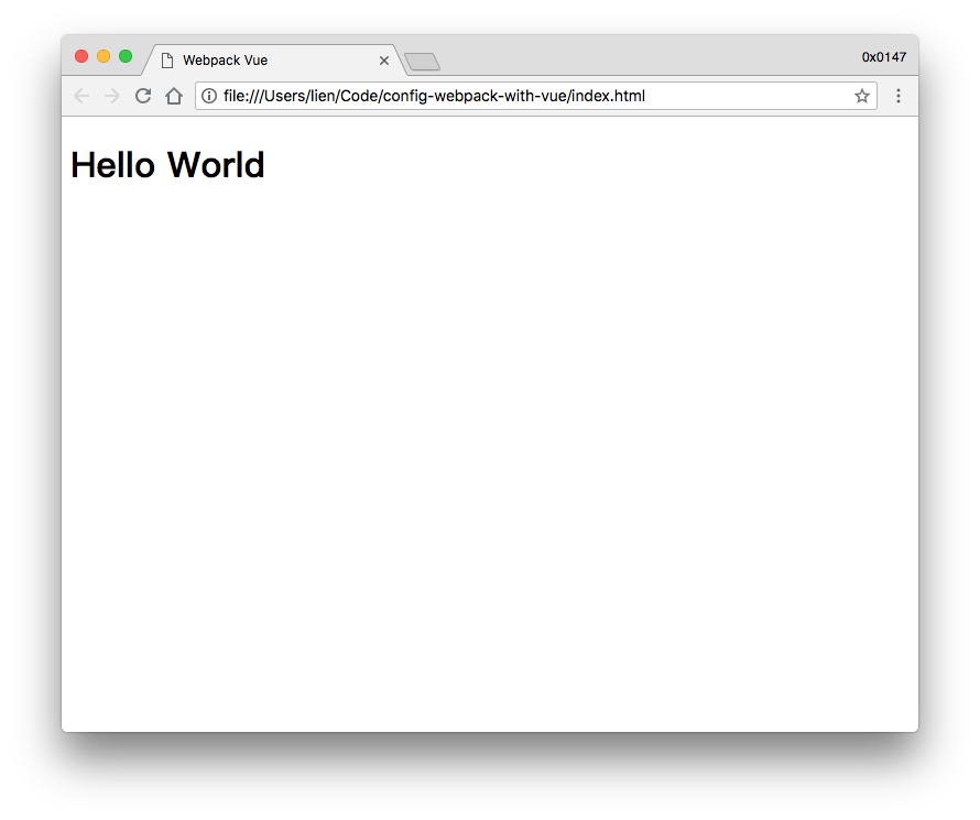 vue.js,但那是运行时版本,我还没到那个步骤,给你一个别名,每次遇到 import vue 的时候, 请你忽略默认 vue.js,自动去找 vue 包里 vue.esm.js 」完成后,在终端里运行 npx webpack 命令,打开浏览器,说好的 <h1>Hello World</h1> 如期而至:
