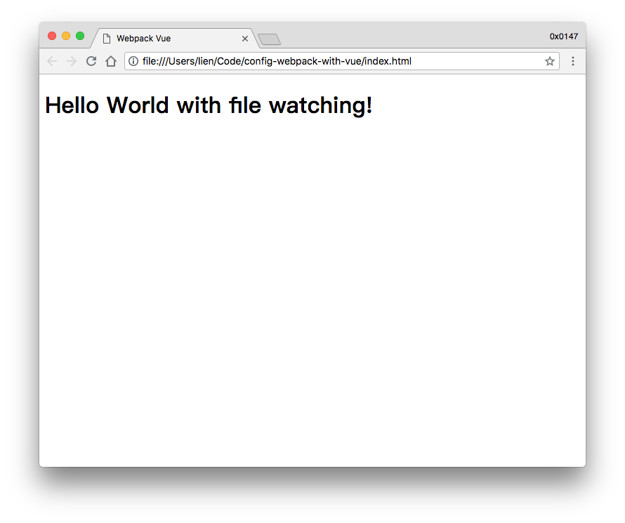 回到 app.js 中,将 template 选项属性中的 <h1>Hello World!</h1> 修改成 <h1>Hello World with file watching!</h1>,观察终端中是不是自动重新编译了?再回到浏览器中刷新,内容也发生了变化。