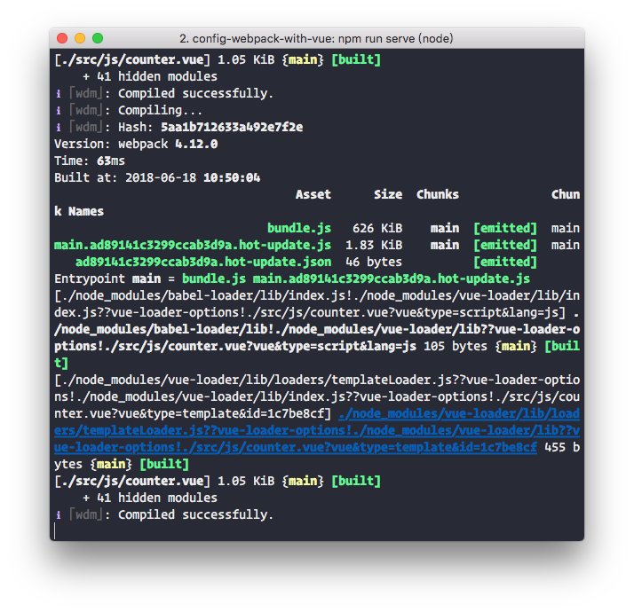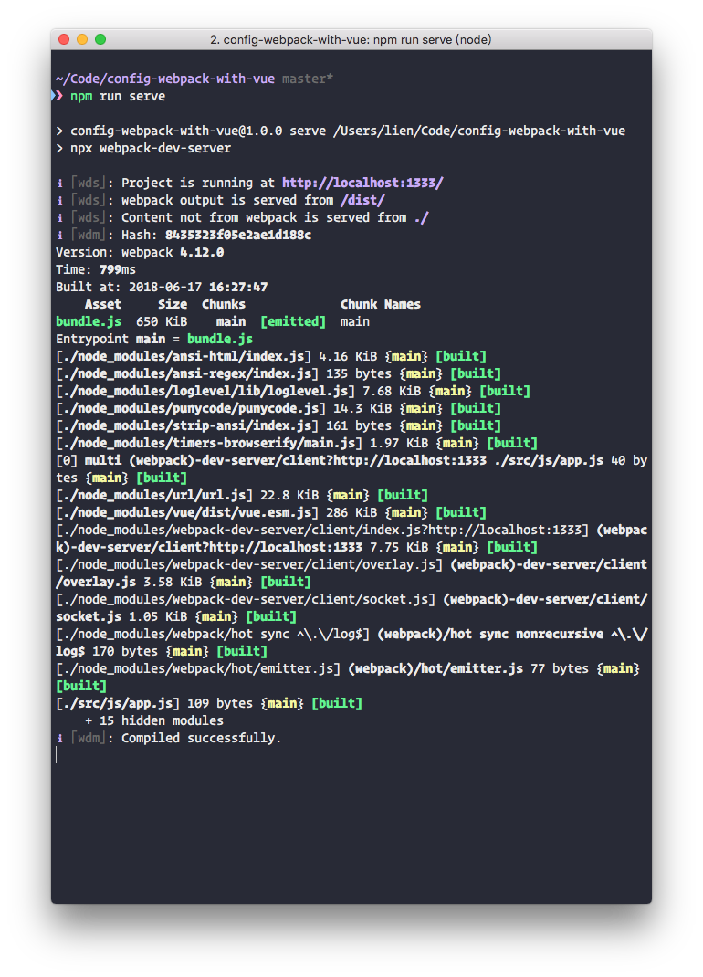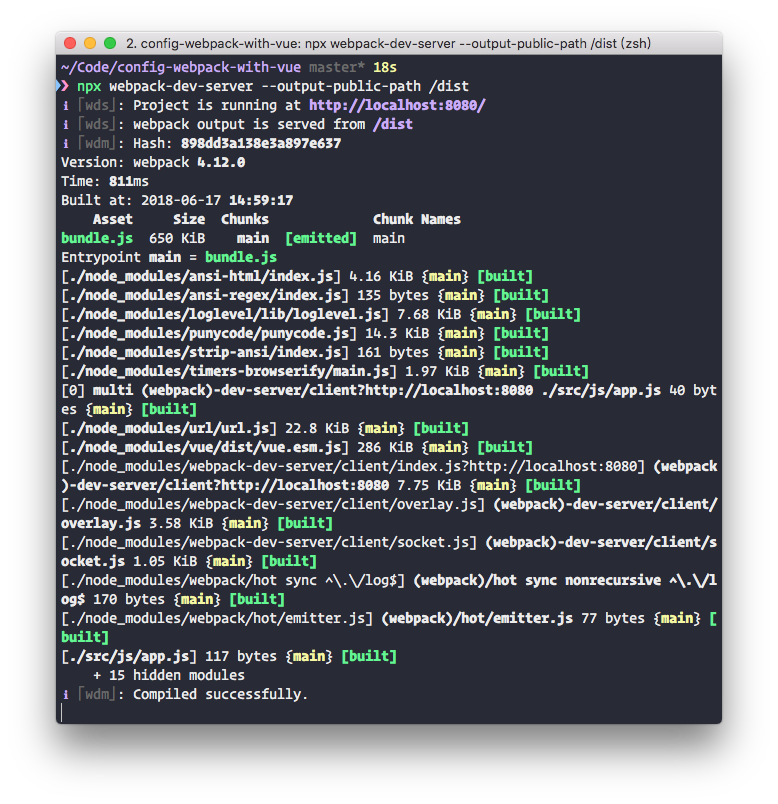 webpack 命令中加入了一个新的 flag:--hide-modules,在编译的时候,不需要告诉我们在编译哪些模块,只需要提示是否成功就可以。还有一些相关的如:--color,--progress 可以配合习惯使用。