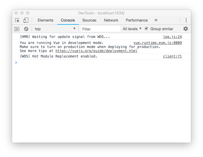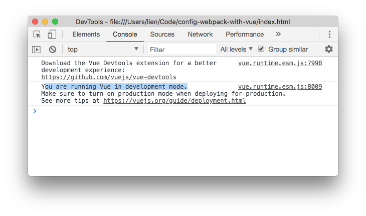 上面说到通过 npm script 将 process.env.NODE_ENV 通过终端 export 的方式传入,但只写了一半,Vue.js 通过 Webpack 构建的时候也会输出不同的版本,同样也是通过 env,最直观区别是当输出完毕在浏览器中打开项目的时候: