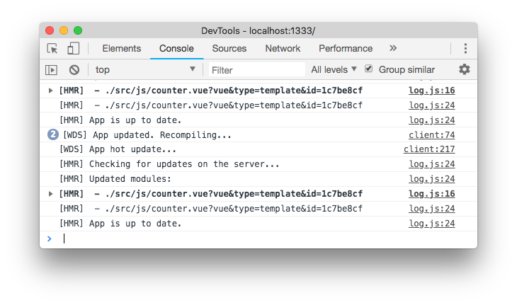 当没有热重载的时候,回到编辑器修改 <template>、保存,Webpack 监听到文件变化之后,会对浏览器里的测试页面进行完全刷新(full reolad),state 在页面刷新之后会丢失。而当开启热重载,测试页面仍然会刷新,但是 state 的值会得以保留。