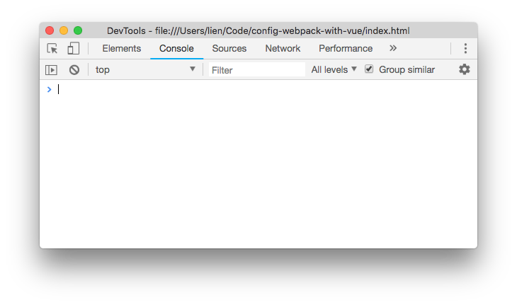 在终端中再次运行 npx webpack 命令进行编译,成功后再浏览器中刷新我们之前打开的 index.html。什么也么有对不对,说好的 <h1>Hello World</h1> 无处寻觅,知道发生问题了,那么问题在哪儿呢?打开浏览器的 inspector,切换到 console 控制台,会有报错信息如下: