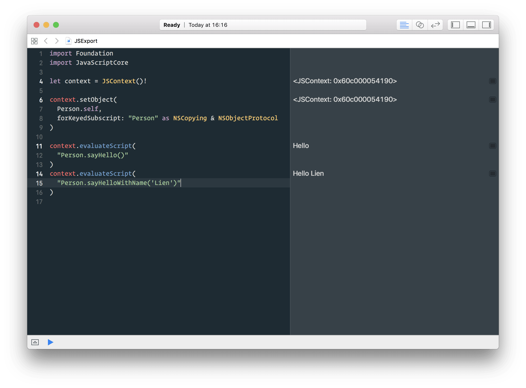 Swift 这里为了方便演示,定义的是一个 static func,也就是 class 可以直接调用的方法,所以直接把 class 暴露出去,也可以定义一般方法,实例新的 class 对象,将对象暴露出去。第三步暴露,有点类似之前 JavaScriptCore 的例子,使用 JSContext 对象的相关方法进行操作,桥接原生和 JavaScript。